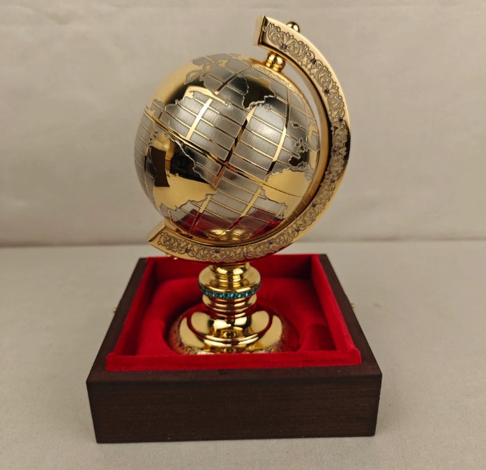 - Сувенирный глобус. Сувенир, изготовленный из натуральных и высококачественных материалов, станет замечательным оригинальным подарком для уважаемого человека и изюминкой кабинета. У нас в магазине, например, можно приобрести глобус «Золотой», который выполнен с применением золочения и никелирования и имеет вставки из фианитов.