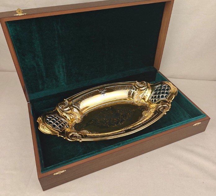 - Конфетница/фруктовница. Полезная вещь, которая позволит аккуратно разместить различные вкусности в кабинете директора. У нас, например, можно приобрести модель «Золотая сказка», выполненную из металла с применением золочения и никелирования.