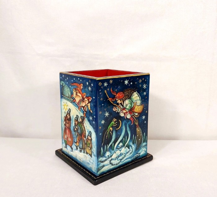 - Украшенный лаковой миниатюрой стакан под письменные принадлежности — тоже отличный подарок. Школьники часто забывают ручки и карандаши. Подставка — и органайзер, и украшение.