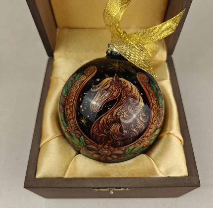 - Расписной елочный шар с символом Нового года. Он создаст праздничное настроение и станет приятным напоминанием о компании в течение всего года. К тому же, они точно смогут принести удачу, ведь вещи с изображением Лошади в 2026 году повышают вероятность успеха у своих владельцев. Если хочется, чтобы у партнера или клиента все сложилось удачно, то подарите ему шар «Конь с подковой» с круговой росписью.