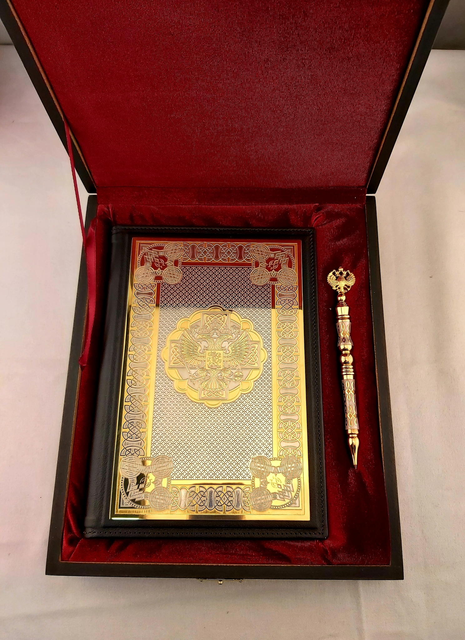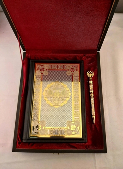 Благодаря нанесенному на обложку гербу ежедневник отлично подойдет, чтобы поздравить работников государственных органов, учреждений и крупных компаний. Эксклюзивная отделка переплета из натуральной кожи тонкой выделки делает такой подарок уместным для сотрудников самого высокого уровня. Ежедневники декорируются металлическими накладками из латуни с оформлением, выполненным по технике Златоуста с применением никелирования, чернения, золочения золотом 999 пробы.