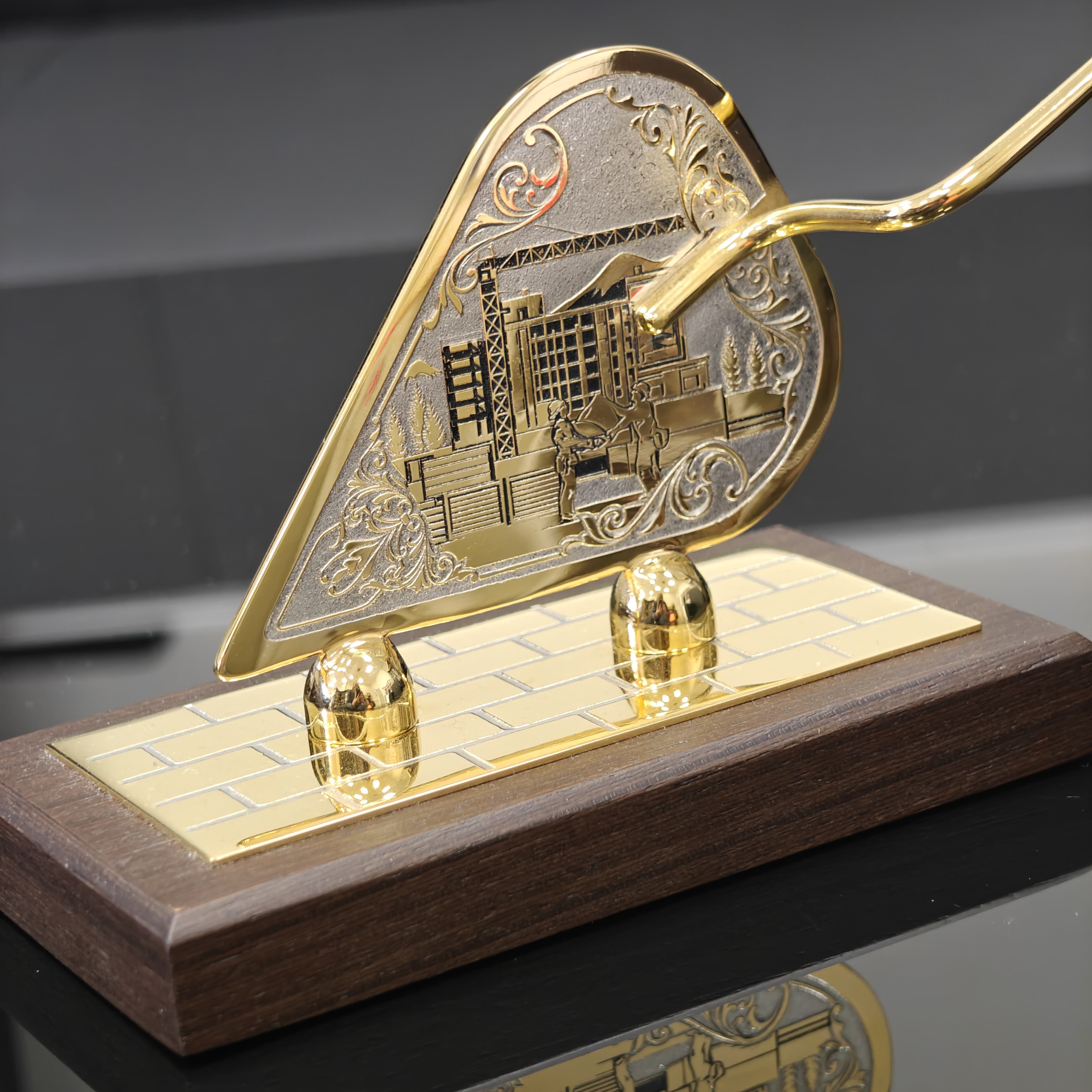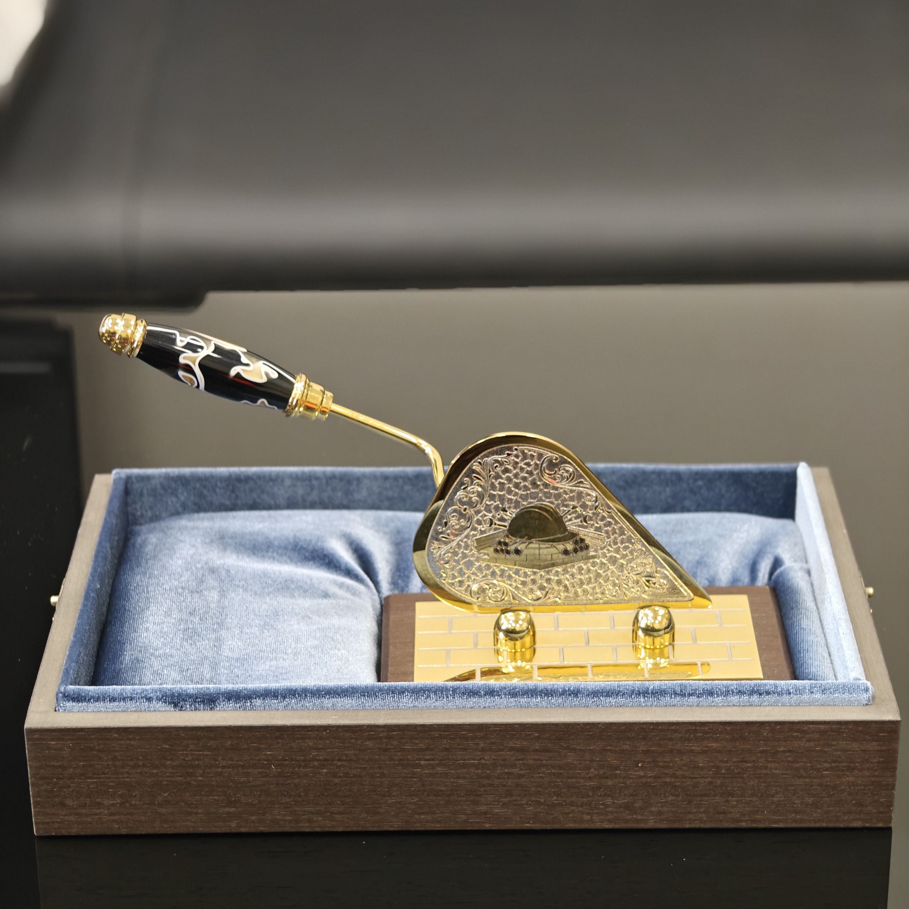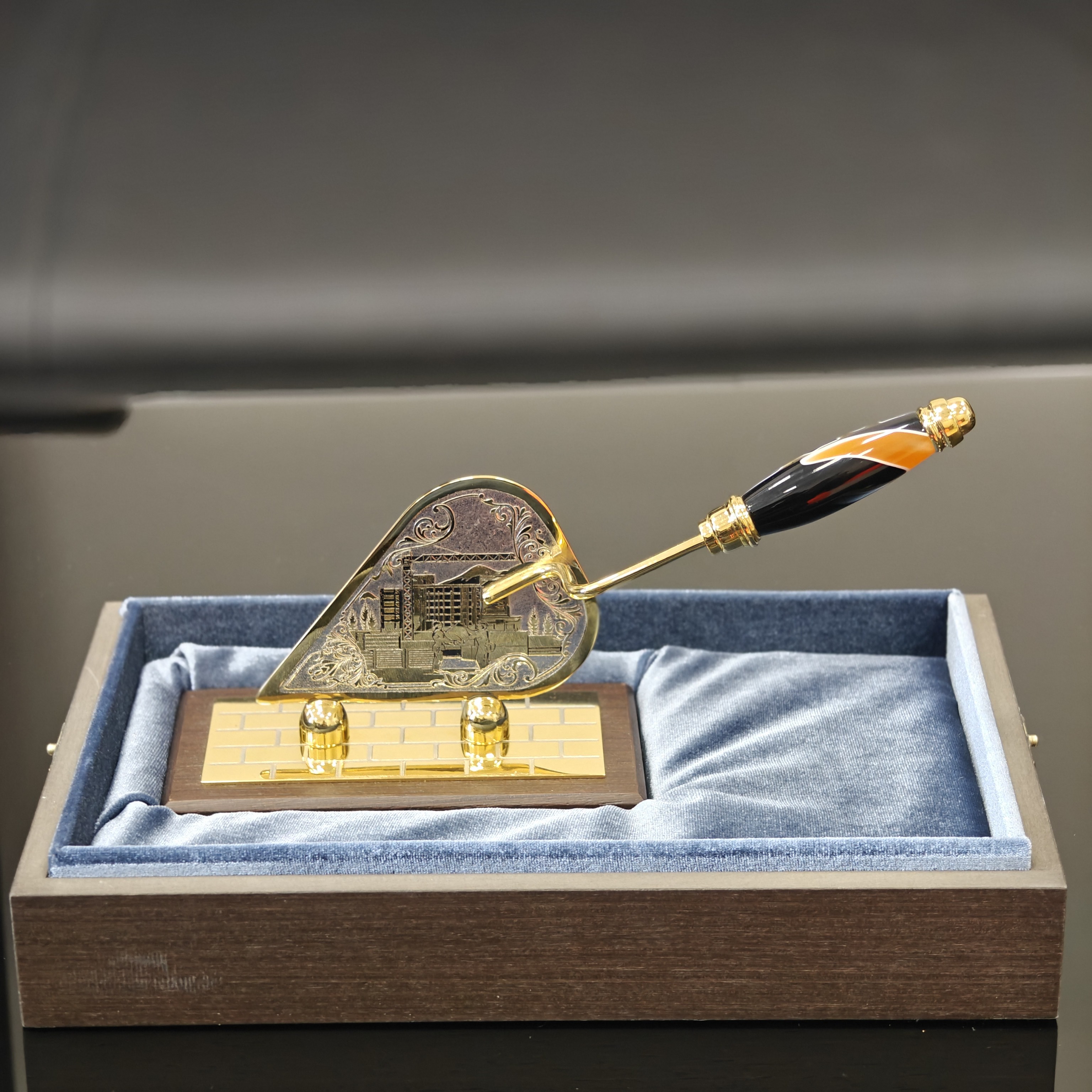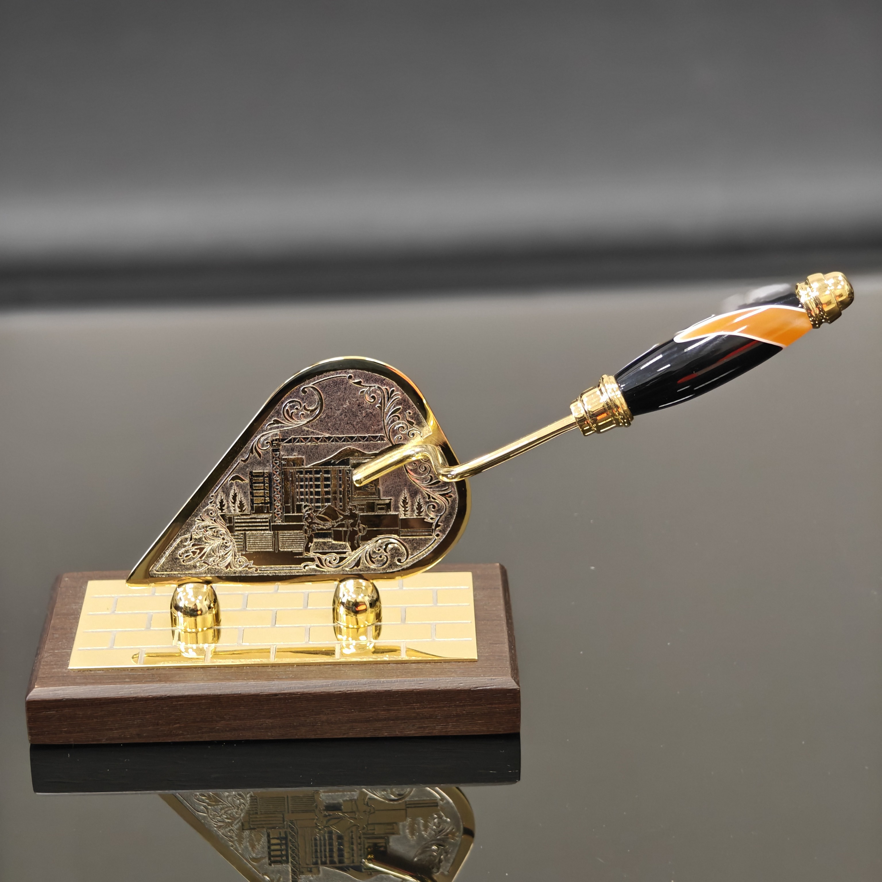 Строительный мастерок, представленный в формате оригинального сувенира, имеет реалистичное исполнение. При его изготовлении используются качественные материалы. Сувенирные инструменты могут быть декорированы фианитами и чернением. Сам мастерок предлагается на долерите и на камне.