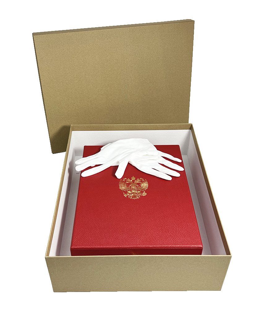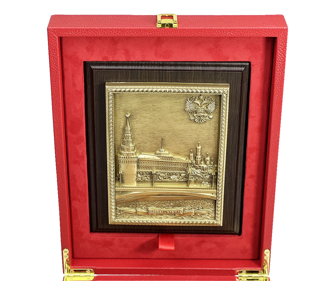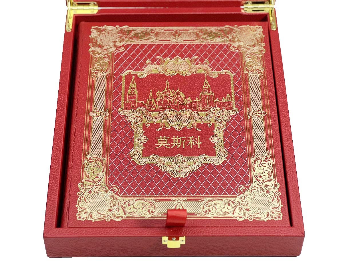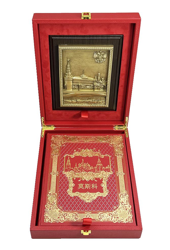 Оригинальный подарочный набор включает в себя книгу в кожаном переплете "Москва" и плакетку, оформленных в деревянной коробке, обтянутой кожей. Дизайн издания представлен сочетанием блинтового, золотого и цветного тиснения. Крашеный обрез. Богато оформленные дюблюрами форзацы, шелковое ляссе. Альбом представлен на английском языке. Плакетка изготовлена из литьевого пластика в сочетании с деревянной основой.