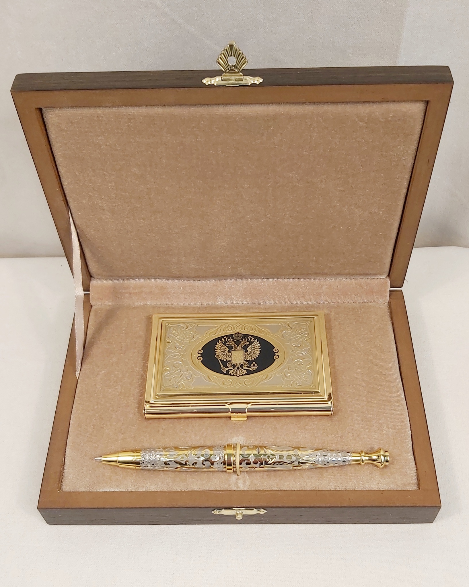 Предлагаем вам купить замечательный набор из Златоуста, изготовленный вручную по технологии златоустовской гравюры на металле с применением золочения, чернения и никелирования. Набор состоит из оригинальной визитницы и стильной ручки. украшенных злотоустовской гравюрой.