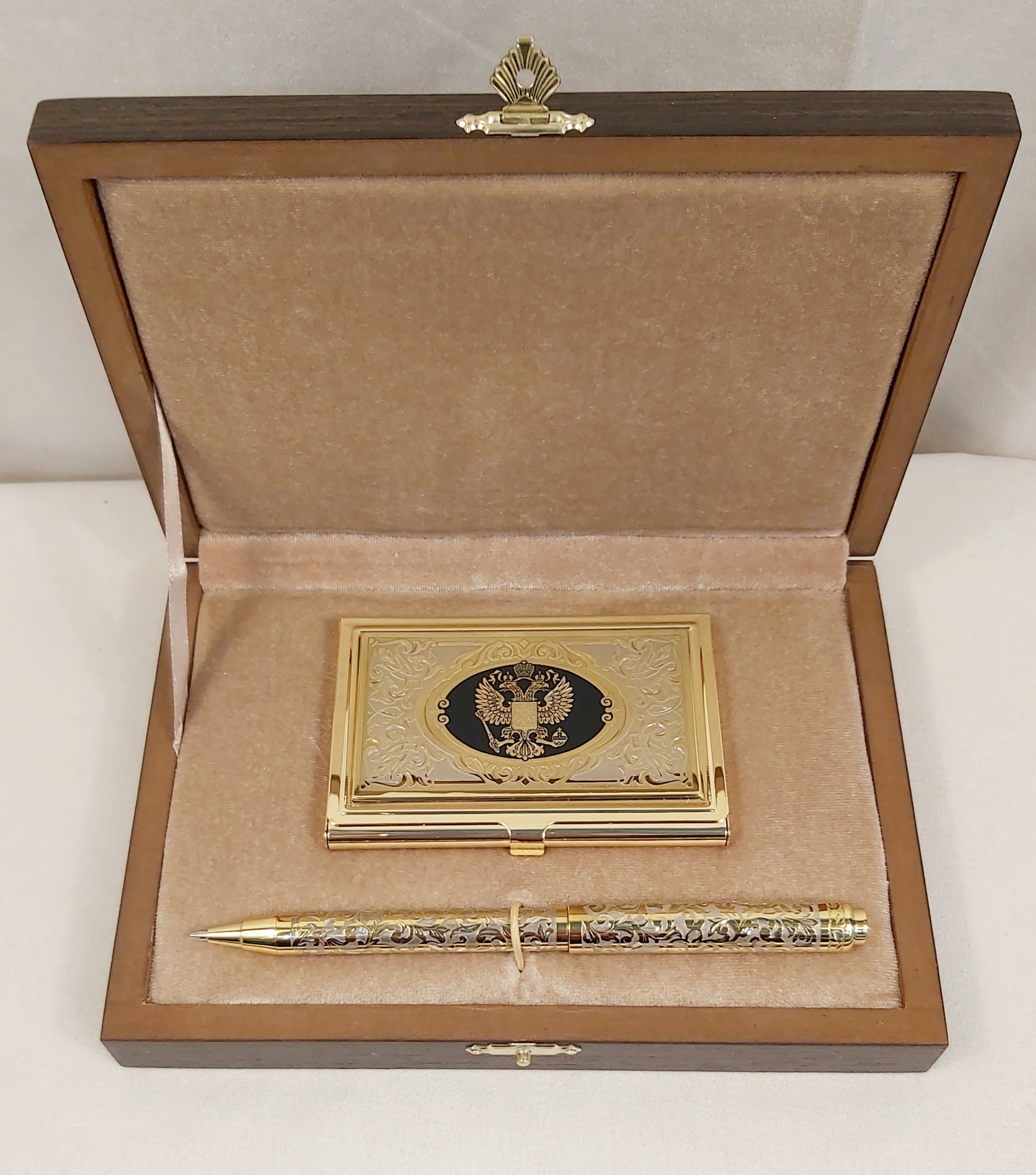 Предлагаем вам купить замечательный набор из Златоуста, изготовленный вручную по технологии златоустовской гравюры на металле с применением золочения, чернения и никелирования. Набор состоит из оригинальной визитницы и стильной ручки. украшенных злотоустовской гравюрой.