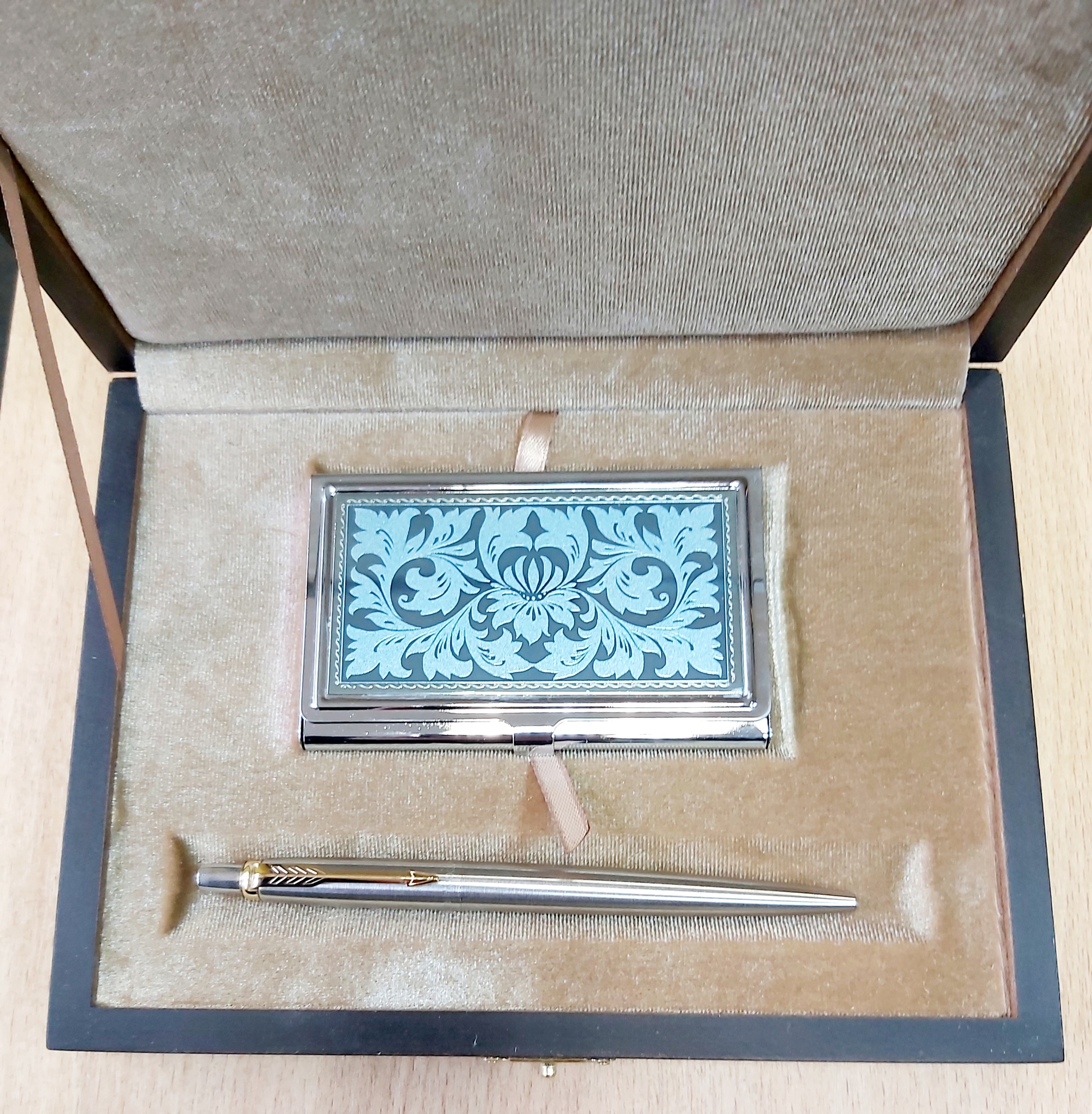 Набор состоит из оригинальной визитницы и металлической ручки Паркер.