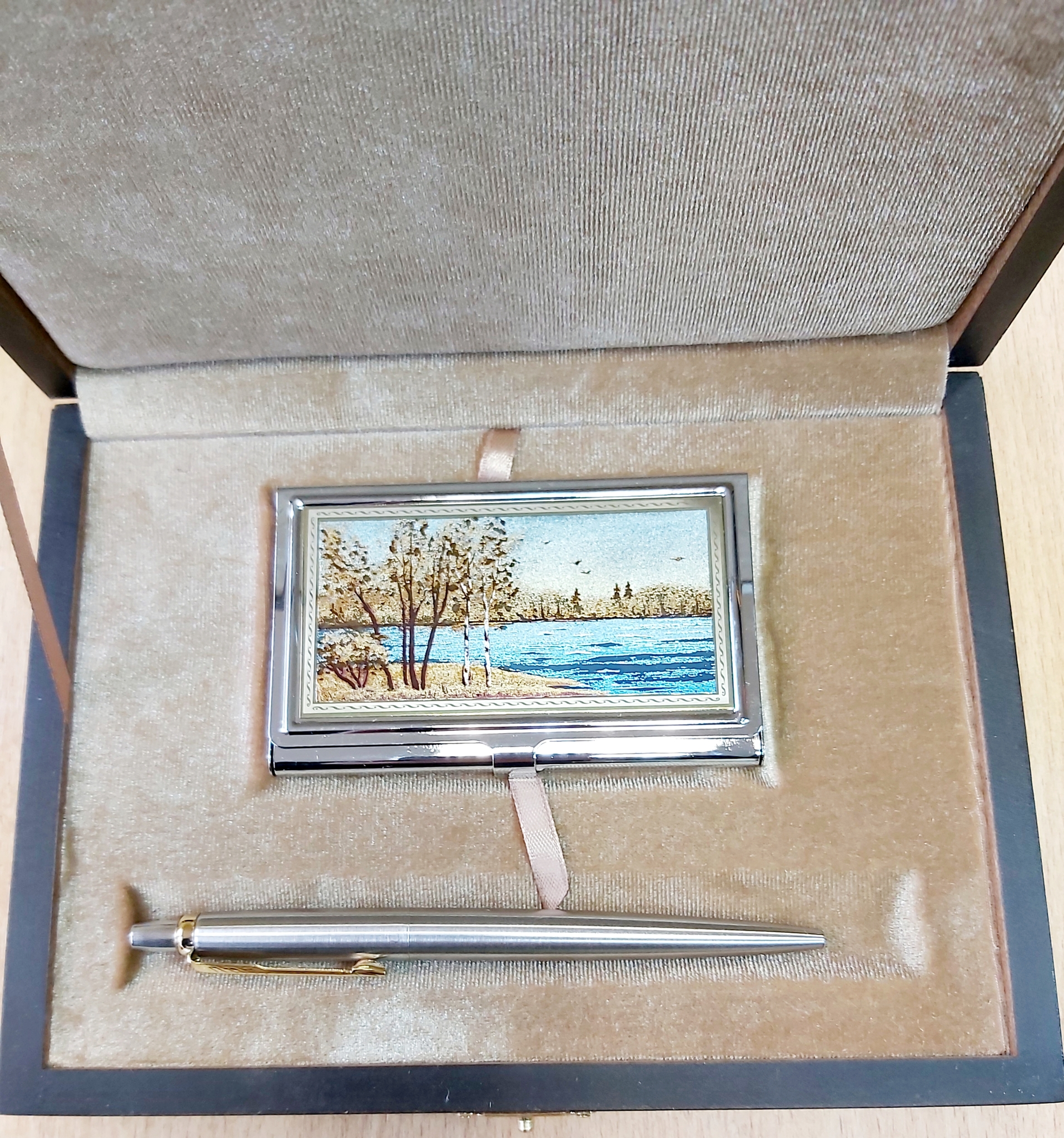 Набор состоит из оригинальной визитницы и металлической ручки Паркер.