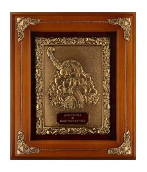 Панно выполнено из дерева. На лицевой части, на металле объемное изображение "Рог изобилия" на бархатной подложке, которое выполнено методом гальванопластики с золочением в виде картины.