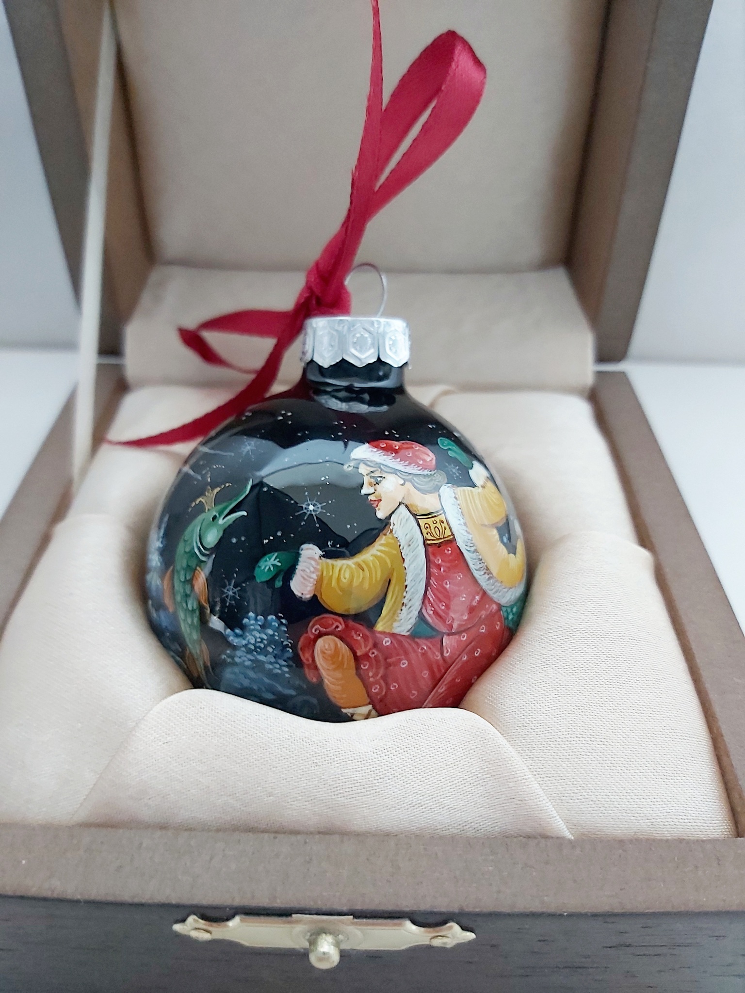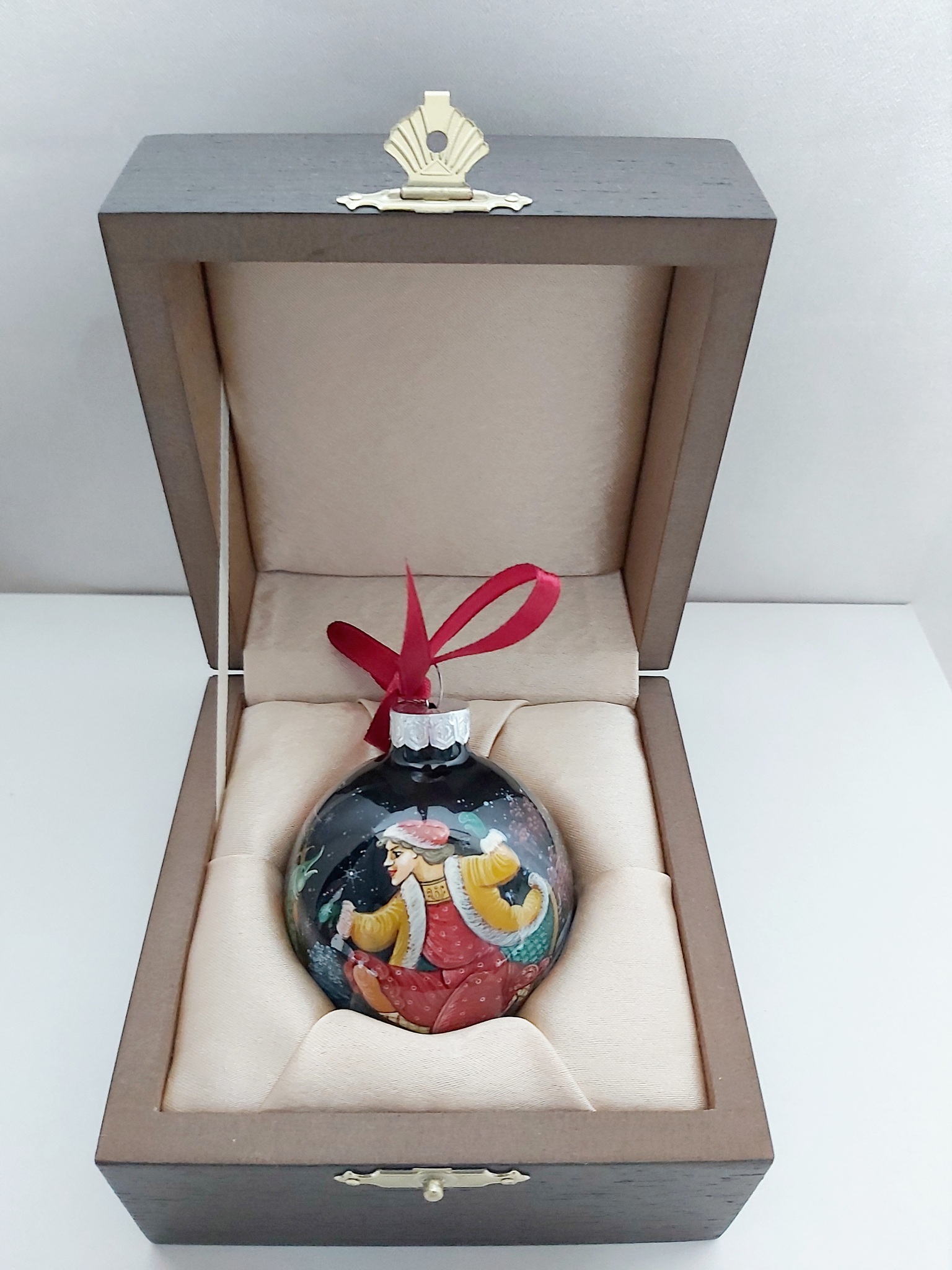 Новогодний шар, изготовленный из стекла и расписанный художниками Палех по традиционной технологии знаменитого русского народного промысла лаковой миниатюрной живописи может стать отличным подарком родным, друзьям, а также иностранным бизнес-партнерам. Такой шар в подарочной коробке можно вручить в качестве ценного сувенира коллеге или руководителю и конечно же коллекционеру столь прекрасных изделий русского народного промысла!